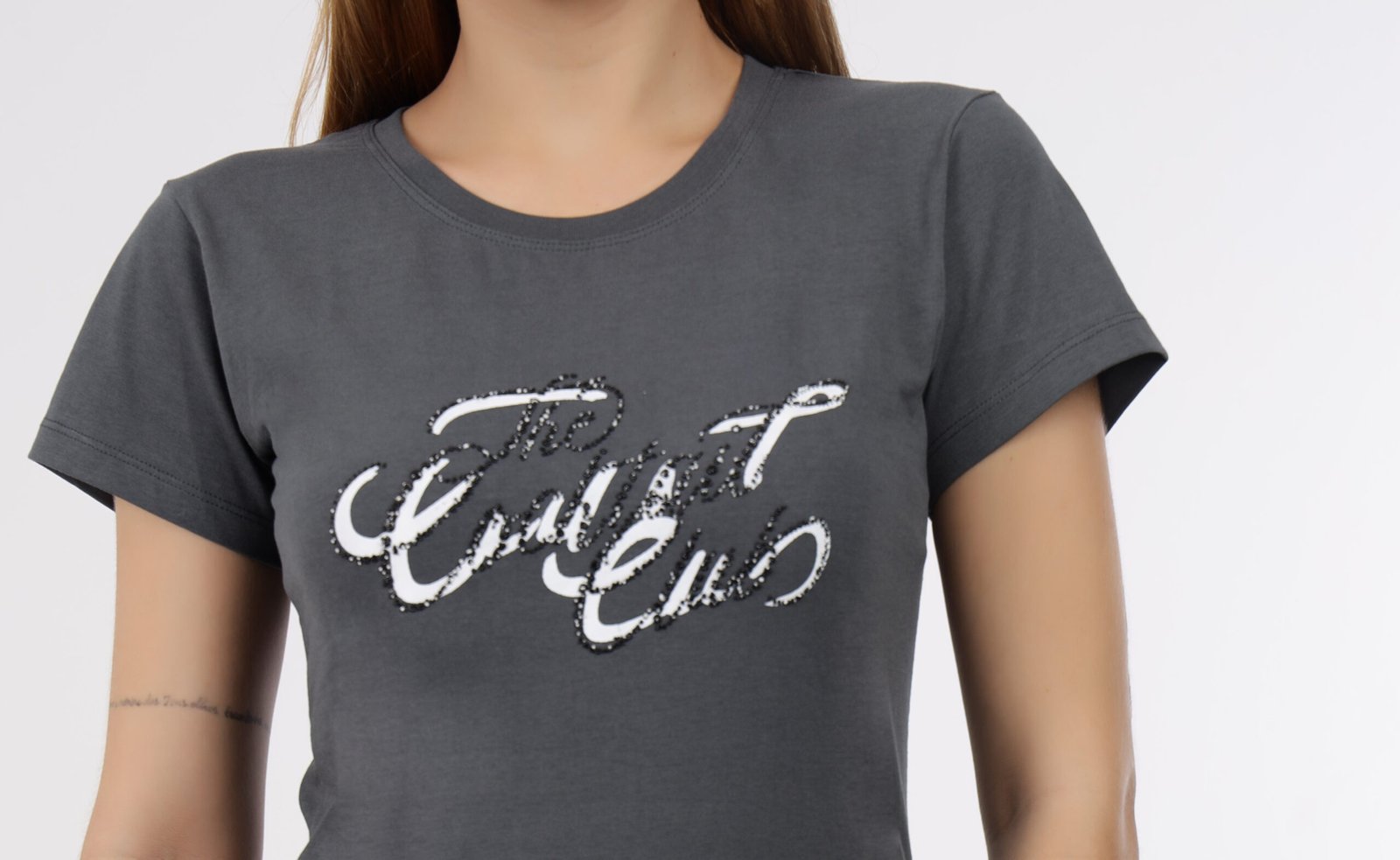 Wineberry Women’s Dark Grey Round Neck Chest Printed Cotton Tee – Comfortable 100% Sinker Fabric