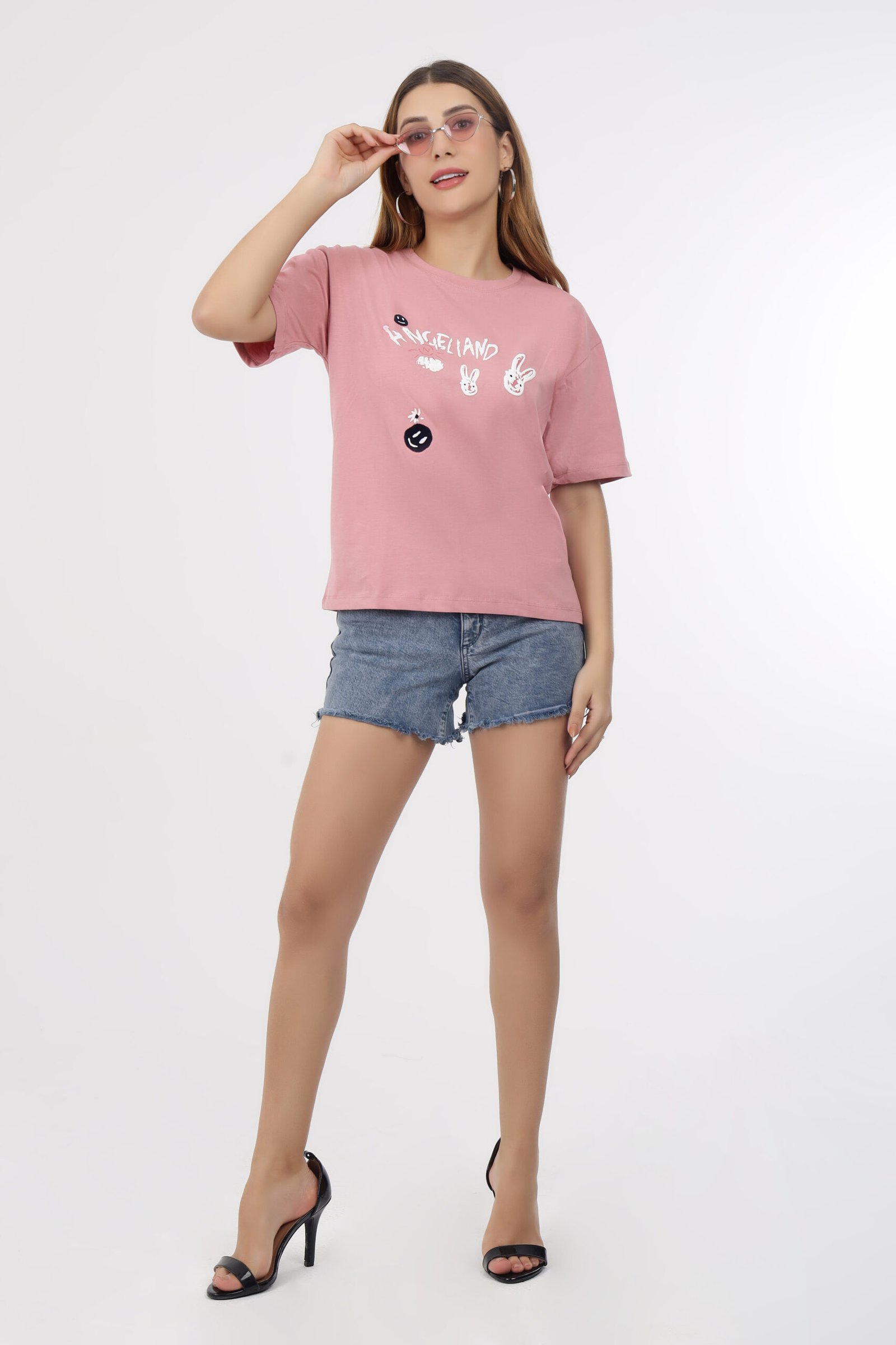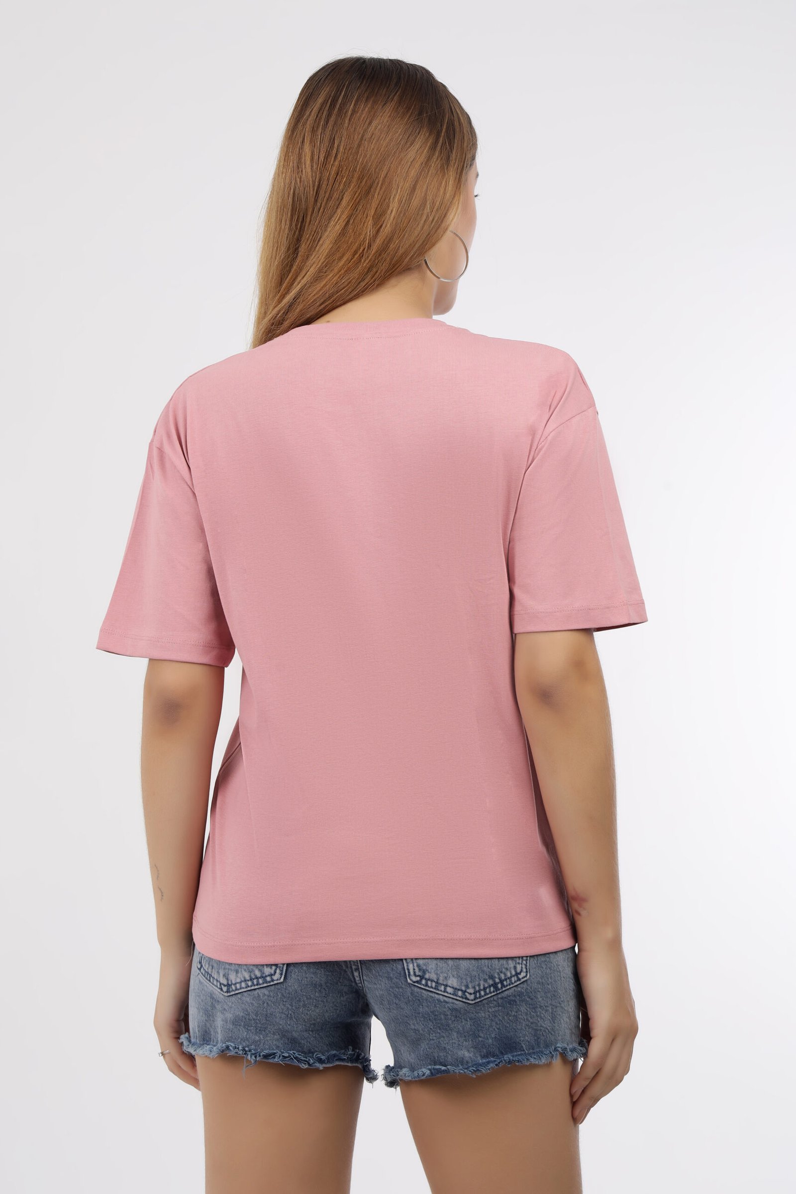 Wineberry Women’s Dull Pink Round Neck T-Shirt Printed – Comfortable 100% Sinker Fabric